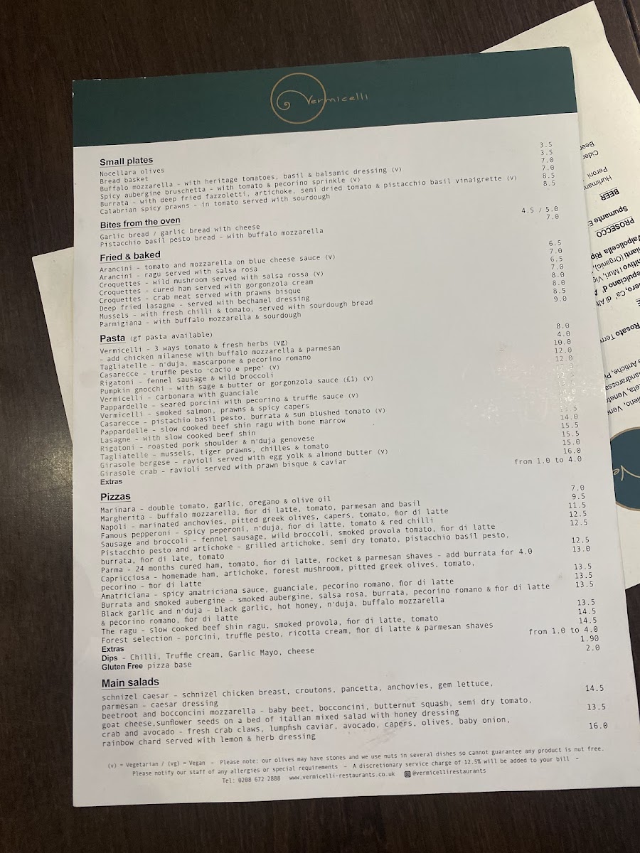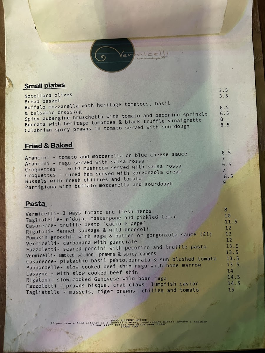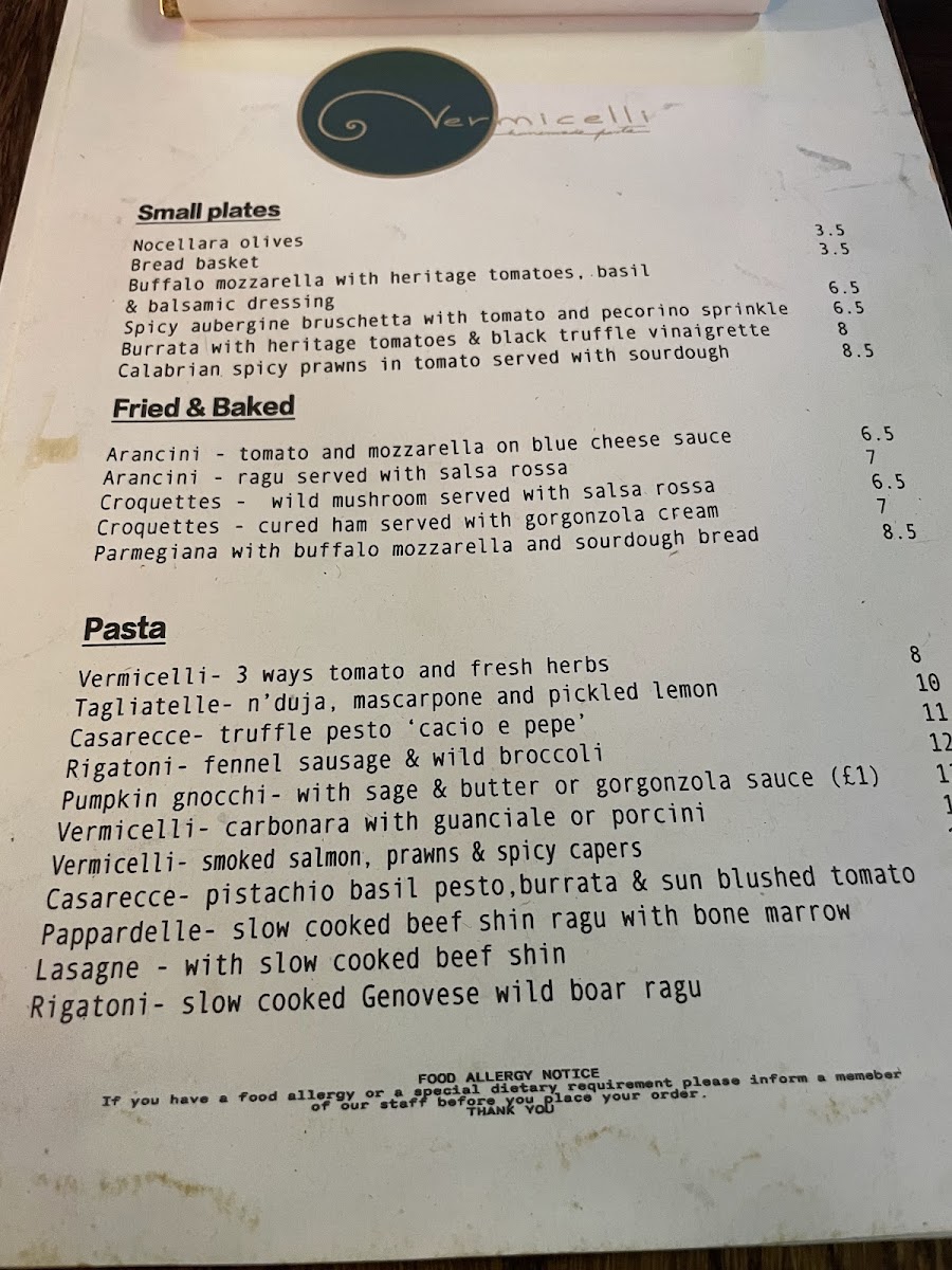 Vermicelli Fresh pasta and Sourdough Pizza (Tooting Market) Menu